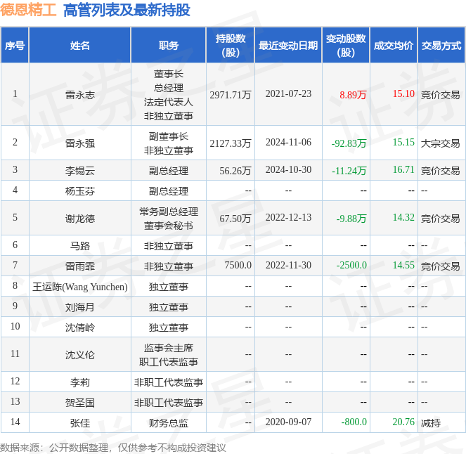 德恩精工近半年内的董监高及中枢时候东说念主员增减握深信如下: