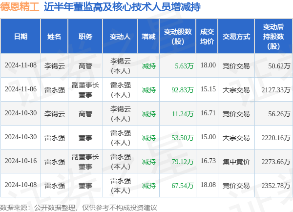 证券之星音问,凭证11月11日商场公开信息、上市公司公告及交往所清晰数据整理,德恩精工(300780)最新董监高及琢磨东说念主员股份变动情况:2024年11月8日公司高管李锡云共减握公司股份5.63万股,占公司总股本为0.0384%。变动时代公司股价高潮4.27%,11月8日当日收盘报17.58元。